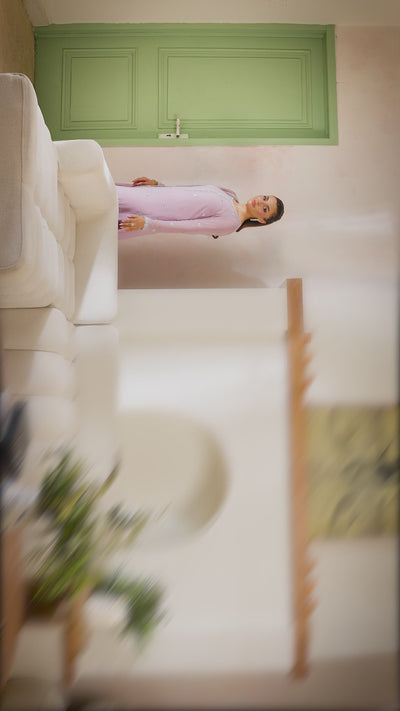 An ethereal lilac statement, crafted with 100% hand embellishment that speaks of precision and patience. The long chiffon shirt flows effortlessly over straight cigarette pants, creating a silhouette that is both graceful and modern. Every element of this piece is brought to life by skilled hands - aari and tilla work, baitki, sequins, sitara, crystals, chain work and more - each detail placed individually, taking days of dedicated labour to achieve this finish.